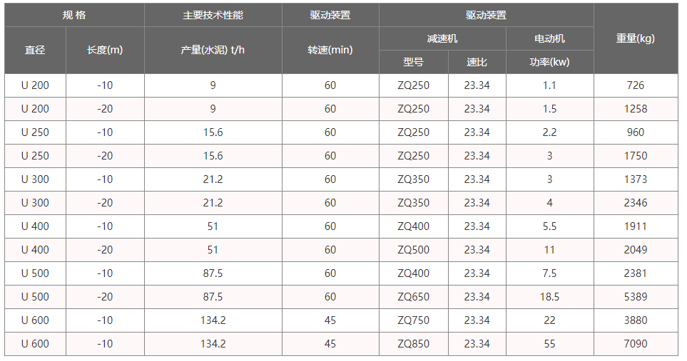 管式螺旋輸送機(jī)適用于水平或傾斜輸送粉狀、粒狀和小塊狀物料,如煤、灰、渣、水泥、糧食等,物料溫度小于200℃,不適宜輸送易變質(zhì)的、黏性大的、易結(jié)塊的物料。參數(shù)如下: